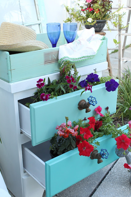 So I've dressed the wayward little rascal in shades of aqua and I'm making him hold flowers and serve lemonade and tea and take care of the garden tools. You see, I'm just making sure he is truly rehabilitated. I let him wear the faucets as knobs just so he didn't get resentful, feeling like he was having to do all "girl work". Faucets are plenty manly, that and holding the tools, right?